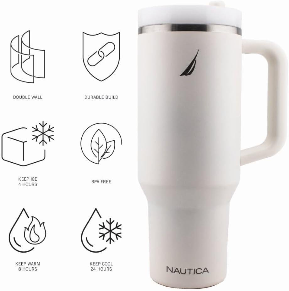 Nautica 40 oz Large Insulated Tumbler with Handle & Straw with screw on cap, Reusable Water Bottle Stainless Steel Travel Mug for Hot Cold or Iced Drink, BPA-Free, Fits Car Cup Holders (Sage)(Cream)