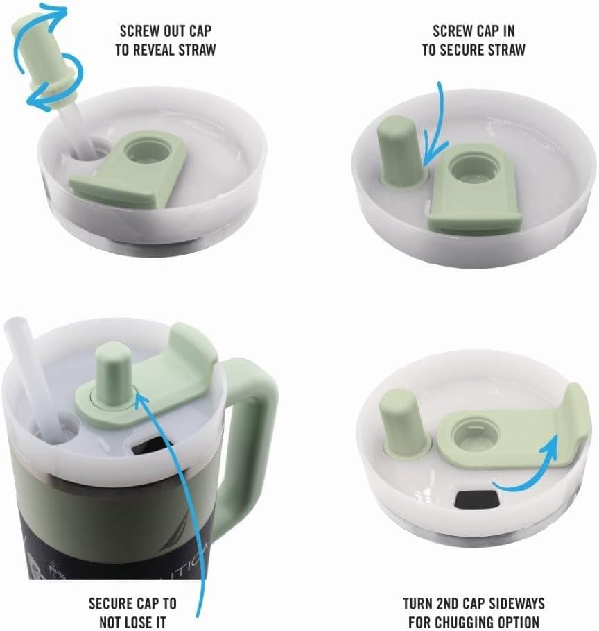 Nautica 40 oz Large Insulated Tumbler with Handle & Straw with screw on cap, Reusable Water Bottle Stainless Steel Travel Mug for Hot Cold or Iced Drink, BPA-Free, Fits Car Cup Holders (Sage)(Navy)