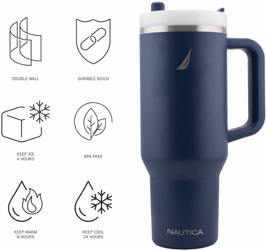 Be the first to review “Nautica 40 oz Large Insulated Tumbler with Handle & Straw with screw on cap, Reusable Water Bottle Stainless Steel Travel Mug for Hot Cold or Iced Drink, BPA-Free, Fits Car Cup Holders (Sage)(Navy)”