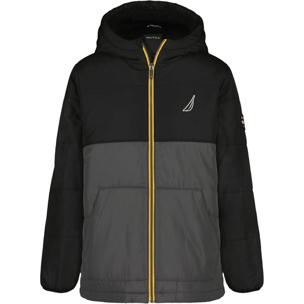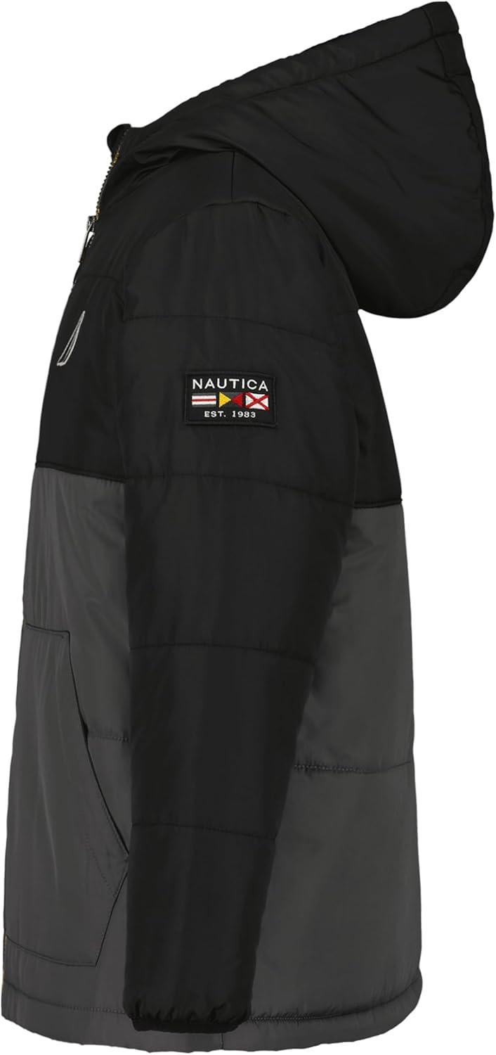 Nautica boys Heavyweight Hooded Bubble Jacket With Polar Fleece Lining(Colorblock True Black)