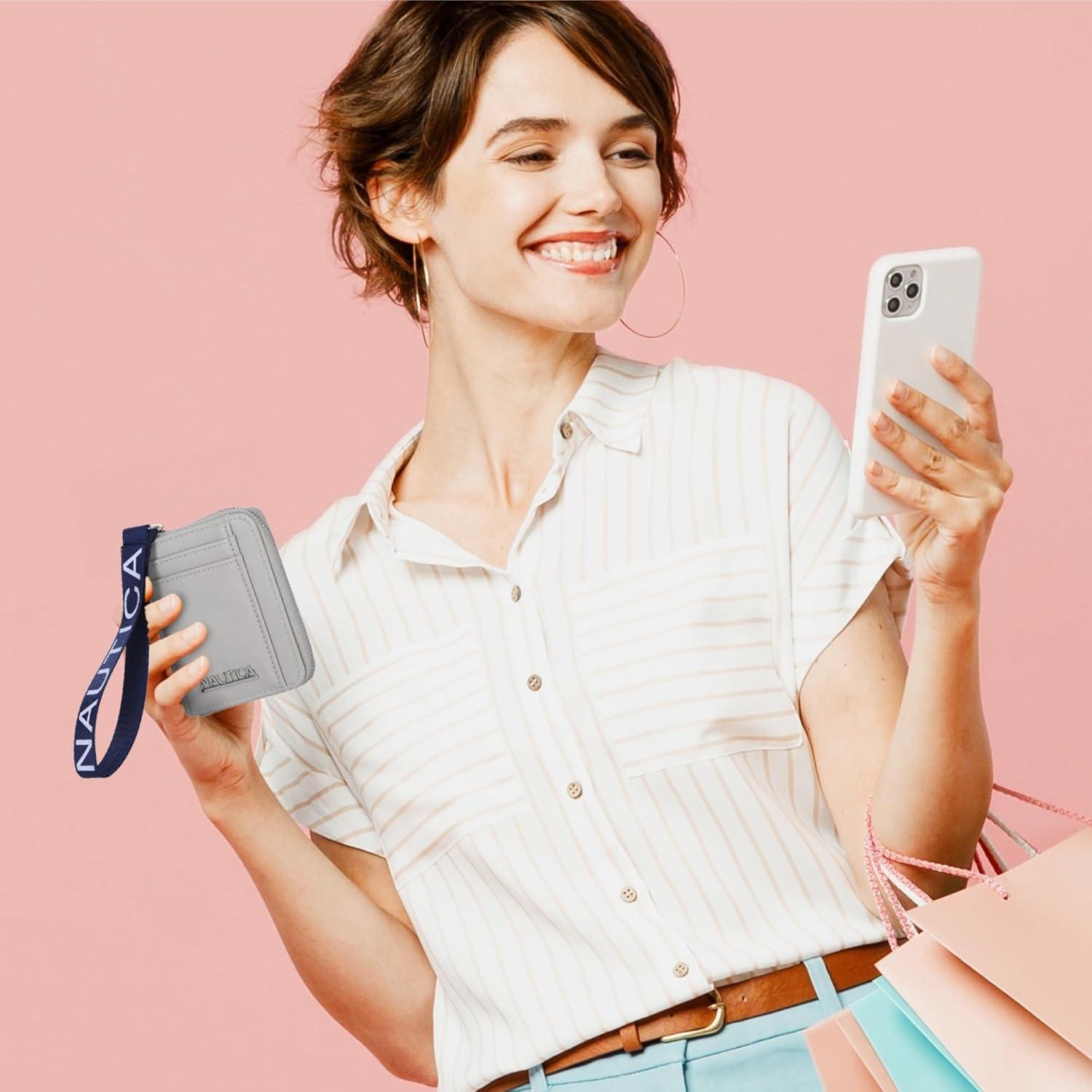 Large Capacity Thin Card Wallet: This female card case wallet includes two exterior card slots holders, one ID window, one large zippered coin compartment, and a wristlet strap. Sized to carry all your essentials in one compact, multifunctional wallet, the Nautica Everglades Card Case provides organization without compromising on style.