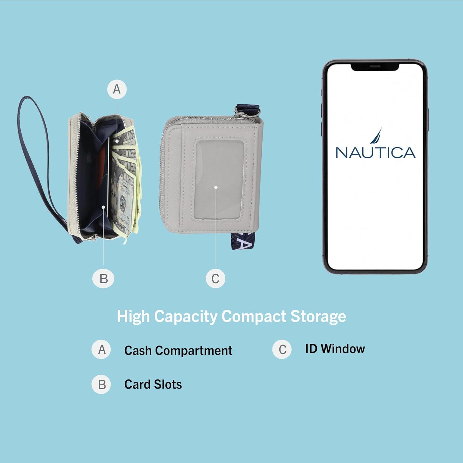 Large Capacity Thin Card Wallet: This female card case wallet includes two exterior card slots holders, one ID window, one large zippered coin compartment, and a wristlet strap. Sized to carry all your essentials in one compact, multifunctional wallet, the Nautica Everglades Card Case provides organization without compromising on style.