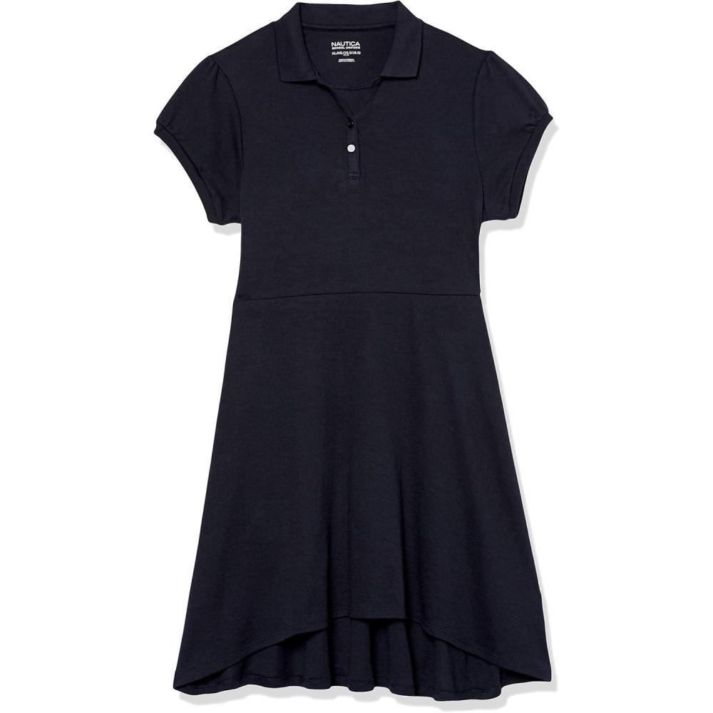 Nautica Girls School Uniform Short Sleeve Polo Dress(Navy/High-low)