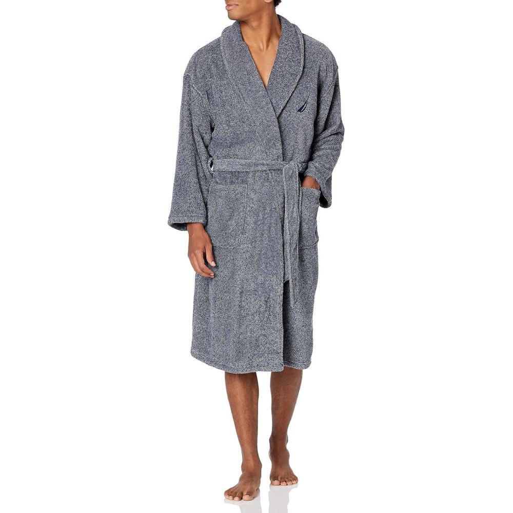 An equally cozy cover-up to top your favorite pair of pajamas, this robe has relaxed shawl-collar styling and a plush fabrication for ultimate relaxation. From Nautica.