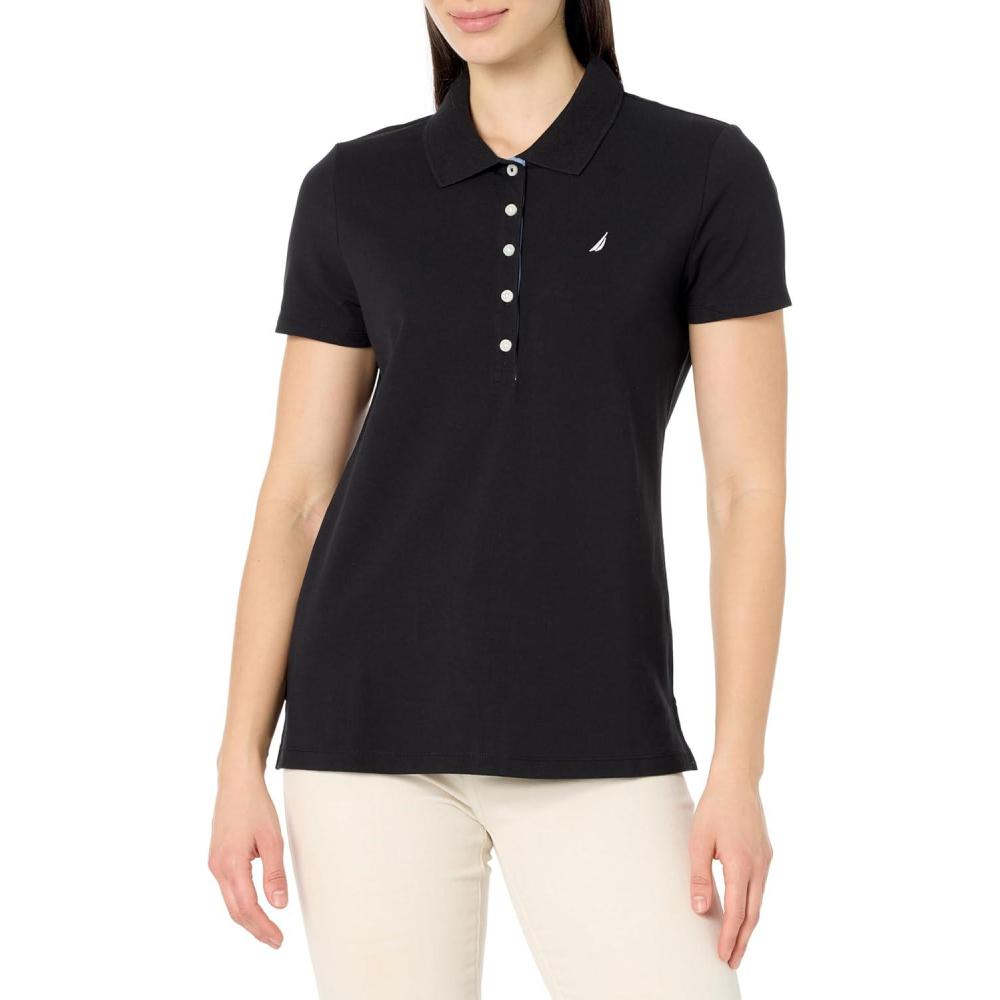 Nautica Women’s 5-Button Short Sleeve Breathable 100% Cotton Polo Shirt(True Black)