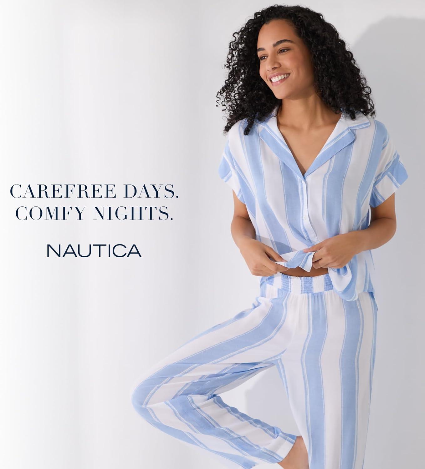Nautica Womens Button Up Pajama Set – 2-Piece Summer Lightweight PJ Set – Top and Pants – Lounge and Sleep Sets for Women(Blue Stripe)
