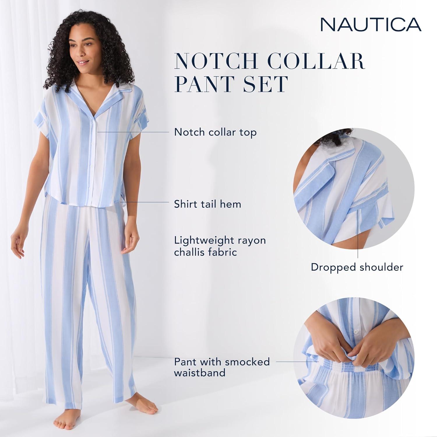 Slip into laid-back luxury with this Nautica Womens 2-Piece pj set, featuring a lightweight short sleeve button-front top and matching pants. Made from 100% breathable rayon, this soft women’s sleepwear set is designed to keep you cool and comfortable through warm nights and relaxed mornings. The classic notch collar and functional buttons add timeless charm, while the elasticized waistband ensures a customizable fit. Perfect for lounging at home, sleeping in, or enjoying a cozy self-care day, this women’s loungewear set blends comfort and style with effortless ease.