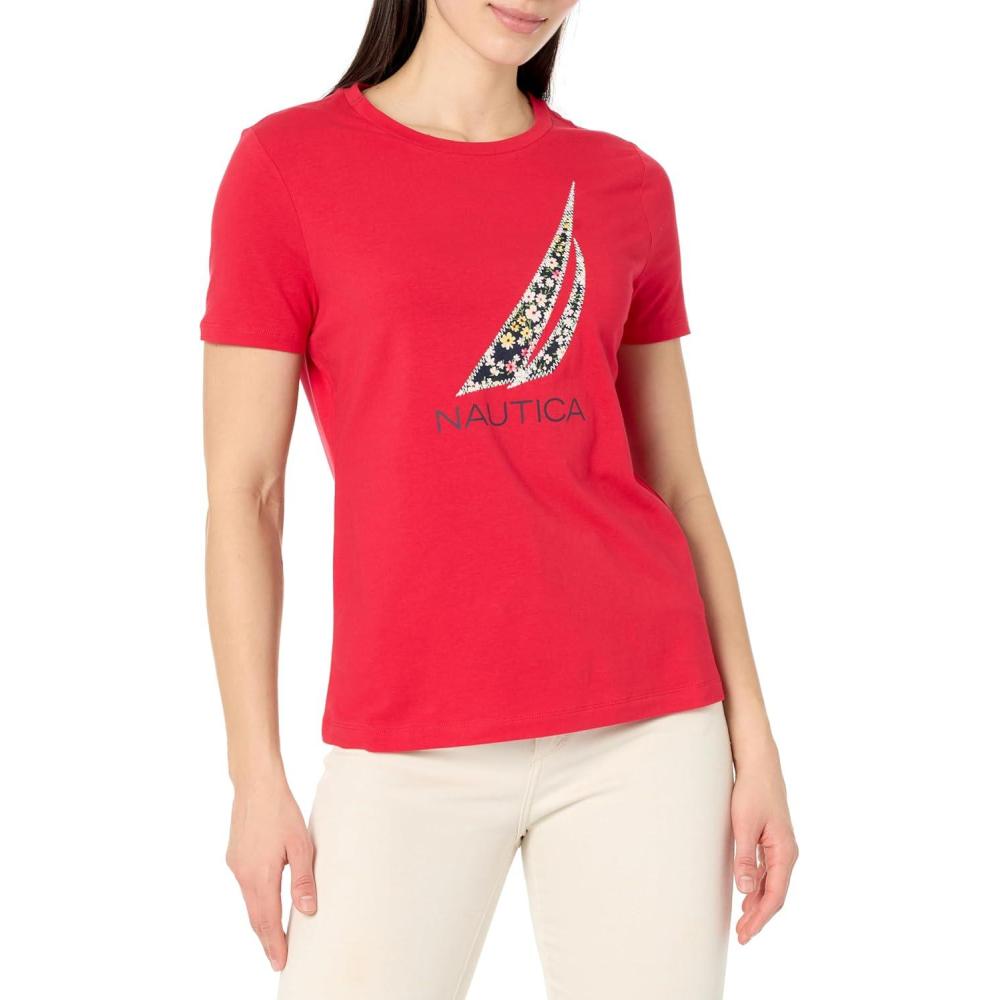 Nautica Women's Graphic Floral Logo Tee Crew Neckline Short Sleeve T-Shirt(Regatta Red)