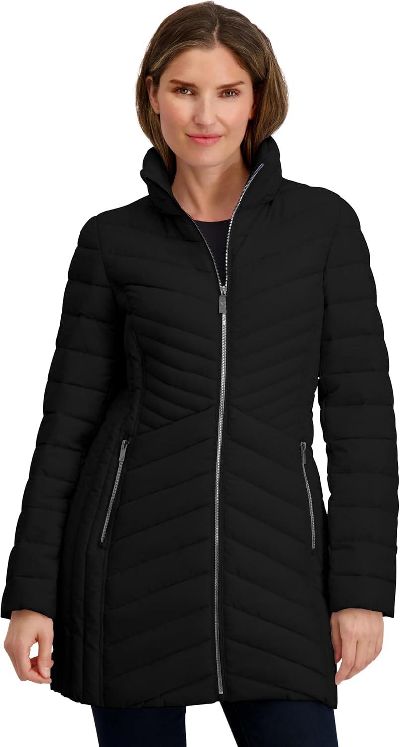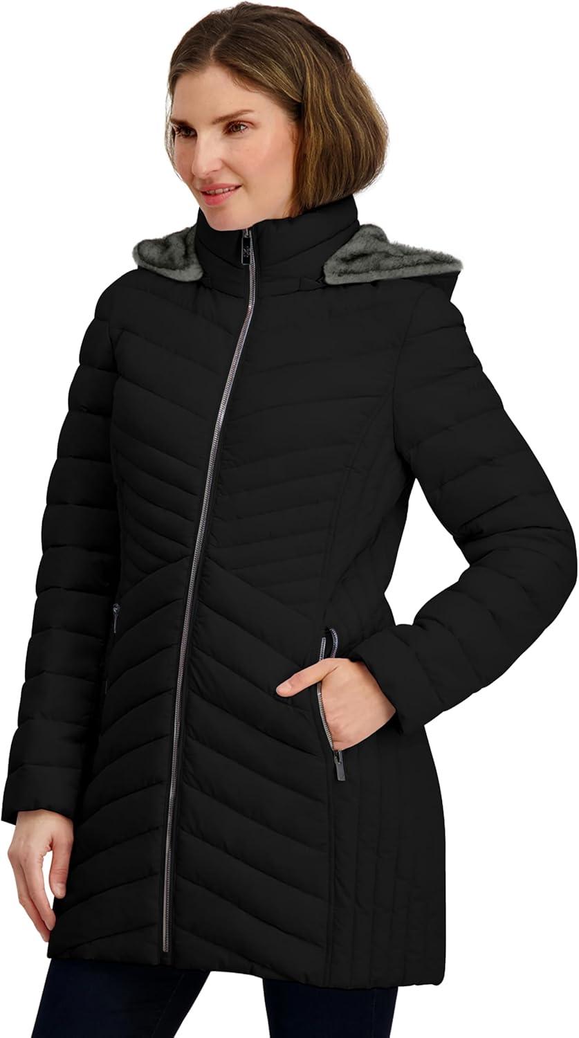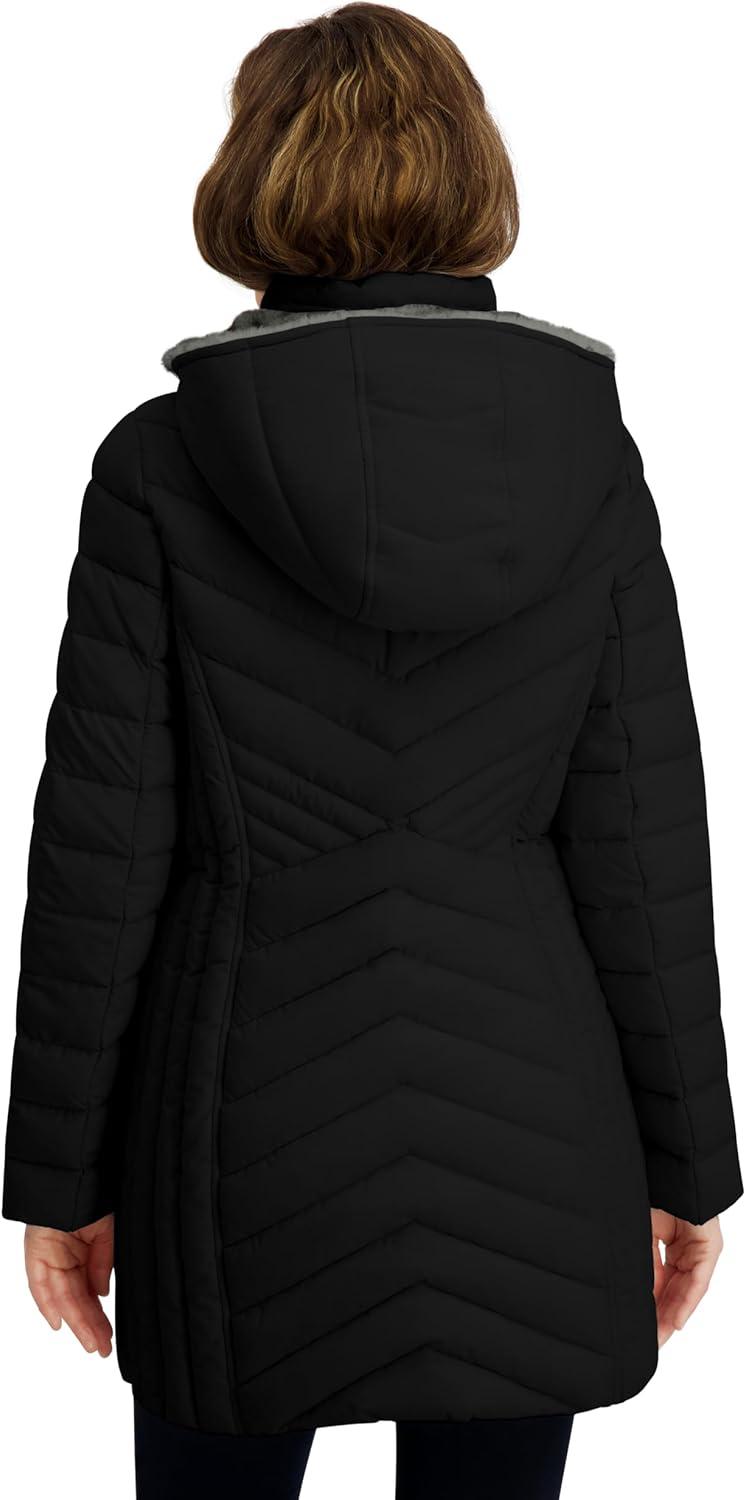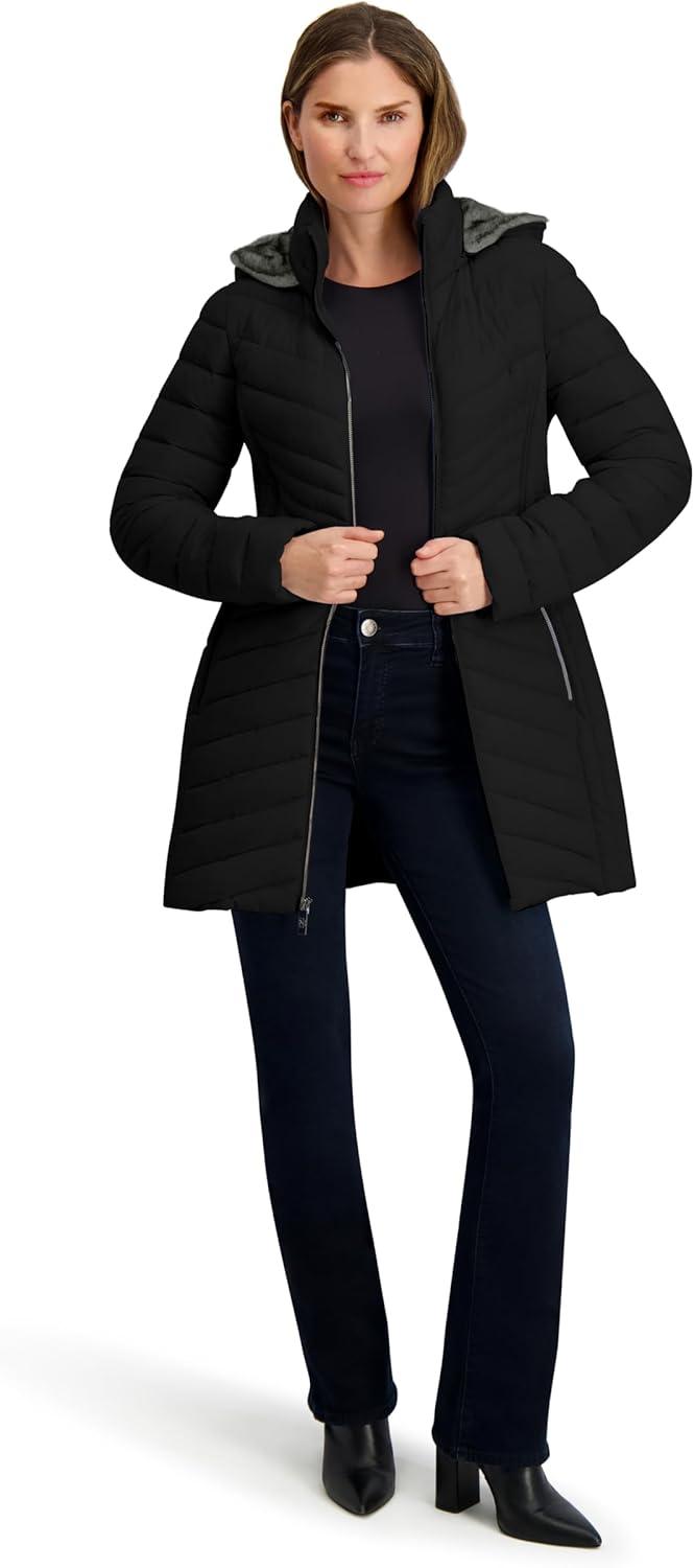 Nautica womens Stretch Puffer Jacket- Wind & Water-resistant Winter Coat Faux Fur Lined Hood(Black)