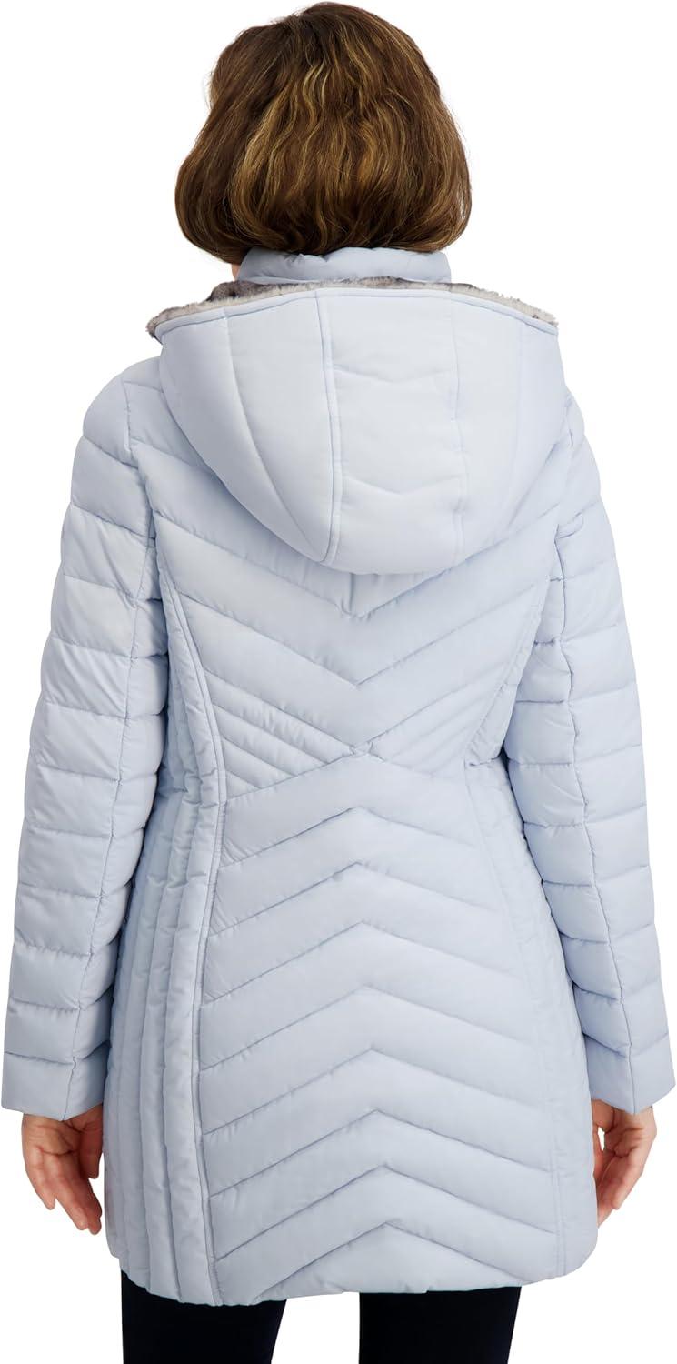 Women's short zip front chevron puffer with removable faux fur trimmed hood