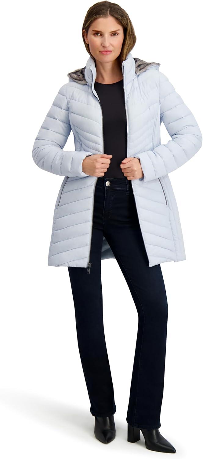Nautica womens Stretch Puffer Jacket- Wind & Water-resistant Winter Coat Faux Fur Lined Hood(Blue)